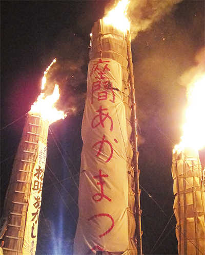 あかまつ会は東日本大震災によって大きな被害を受けた同市を支援し、その想いを風化させまいと、2012年に結成された。昨年は市内で調達した茅や竹を使い、高さ8mほどの松明を製作し、祭りに参加した。