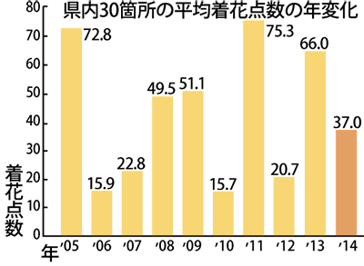 今年度は11月に県内30カ所の測定ポイントで40本のスギを抽出し、調査員が着花状況を判定。その平均値を調査地点ごとの着花点数としてまとめた。