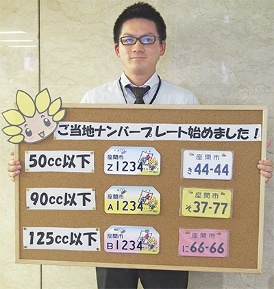 市のマスコットキャラクター「ざまりん」が描かれた原動機付き自転車専用のご当地ナンバープレートの交付が、4月1日から開始された。初日には50枚、1週間で123枚が交付された。