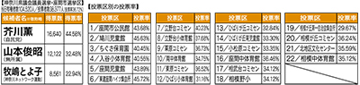 県議選は2011年が無投票だったため8年ぶり。保守系の山本氏と芥川氏、神奈川ネットの牧嶋氏、三つ巴の選挙となった。