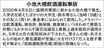 入学式を終えたばかりの2人の大学生が犠牲になった「小池大橋飲酒運転事故」から15年。5年6カ月というあまりに軽い量刑を前に、「危険運転致死罪」成立に向け奔走したのは、被害者の母・鈴木共子さん(栗原中央)だった。かつて、身を裂くような怒りと悲しみをエネルギーに声を上げ続けた母は今――。アーティストとして都内を拠点に活動している鈴木さんのもとを訪ねた。