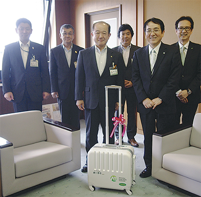 この日は加藤社長らが市役所を訪れた。寄贈を受けて遠藤三紀夫市長は、「コンパクトで従来の発電機の様に大きな音もしない。災害時は勿論、様々なシーンで活用できれば」と話した。