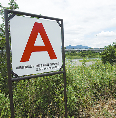 水難事故の発生に備えて座間市消防署が5月30日、緊急通報時に位置を確認できるようにと、相模川沿い5カ所に看板を設置した。