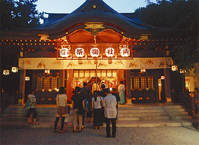 同神社の祭事のなかで最も重要とされる祭り。毎年8月1日に行われ、境内と周辺に出店が並び、多くの地域住民が訪れる。