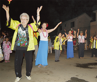 天候に恵まれた8日は、親子連れなど約600人が訪れた。提灯に彩られた特設舞台の周りでは、盆踊りを楽しむ人の輪が出来上がっていた。
