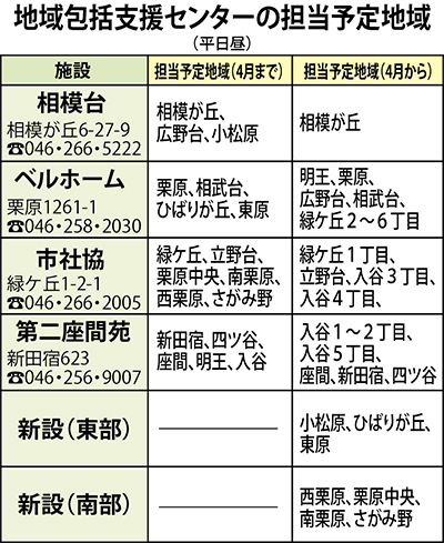 現在、市内には4つのセンターが設置されているが、今年4月には新たに2ケ所増設される。新エリアでは、南部に「栗原ホーム」などを運営する社会福祉法人敬心会(栗原中央)、東部に相模台病院などを運営する医療法人興生会(相模が丘)が内定。3月に市長の承認を受け、正式に運営を任される。担当エリアと施設は表の通り。