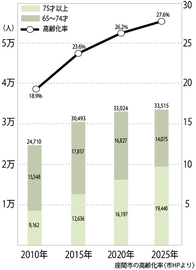 地域の高齢化が止まらない。全市民のうち65歳以上の割合を指す「高齢化率」は年々上昇し、座間市では2013年、WHOなどが定義づける「超高齢化社会」の基準である21%を上回った。この勢いは止まらず、専門機関(※)が2013年に発表した将来推計人口によると、座間市の高齢化率は2030年までに3割を超え、2035年には全体の3分の1に達すると見られている。