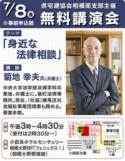 今回のテーマは「身近な法律相談」。数多くの事件や社会問題を担当し、日本テレビ「行列のできる法律相談所」や「スッキリ!!」のレギュラー出演でもおなじみの弁護士・菊地幸夫氏を迎え、土地と建物の法律相談を中心に消費者問題の実態なども盛り込んだ話を披露する予定。定員100人で、事前申込制(7月6日(水)まで)。申込み・問合せは同支部事務局(下記)へ。