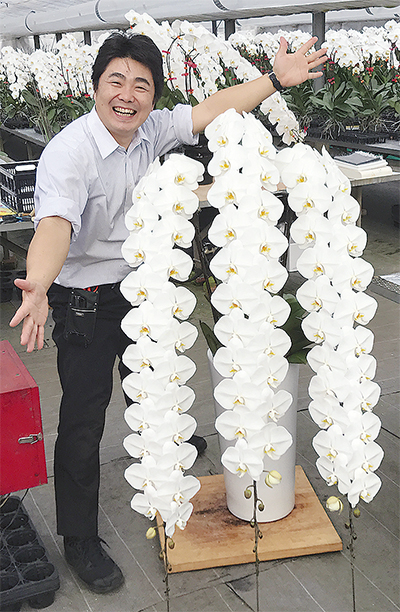 全国から約100点の出品があった東京砧(きぬた)花き園芸市場品評会の洋ラン部門で、(有)座間洋らんセンター(栗原)の加藤春幸さん(36)が手掛けた「ザ・プレミアム・ホワイト」が、最高位の農林水産大臣賞を獲得した。高さ約140cm、蕾(つぼみ)も合わせて100輪という白色胡蝶蘭。その目新しさや、開発に取り組む姿勢が高く評価された。
