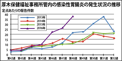 座間市など5市町村を管轄する厚木保健福祉事務所管内において、感染性胃腸炎の患者が急増している。第48週(11月28日〜12月4日)の定点あたりの報告数は、流行警報基準値(20)を大きく上回る37・55となっており、過去10年の同週で最多。例年は12月中旬にピークを迎えることから、同事務所は予防を呼びかけている。 ※12月12日起稿
