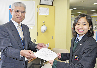 座間総合高等学校は今年度実施した文化祭(向日葵祭)の売上金の一部を座間市社会福祉協議会に寄付するため3月13日、生徒会長のガガリンユリカさん(2年)と同校職員が同協議会を訪問した。