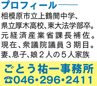 一昨年の安保法制審議の際は尖閣諸島を守る対案提出者として答弁に立ち、厚木基地の夜間飛行訓練中止など地元課題の解決にも取り組んでおります。どうぞよろしくお願いいたします。