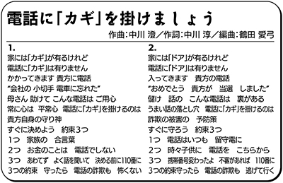 歌詞には振り込め詐欺でよくあるフレーズや、騙されないための約束事を盛り込んでいる。中川さんは「せっかくなので地元の人に歌っていただきたい」と、歌い手として収録に協力してくれるボランティアを募集している。