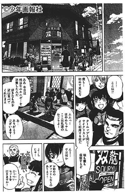 緑ケ丘の「北京料理双龍」(守屋朗店長)が、月刊誌「ヤングキングアワーズ」7月号で連載中のマンガ「はやめブラストギア」に登場している。