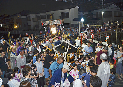 今年は約千人が来場。近隣住民らが神輿の担ぎ手となり、町を練り歩いた。フィナーレでは大人神輿と子供神輿が合流し、圧巻の光景に。威勢のいい掛け声が20分ほど響き渡り、無事に宮入した。大矢総代長は「九州の大雨被害が深刻だが、目久尻川も拡幅工事する前は氾濫があった。今年一年、安心・安全に暮らせますように」と話した。