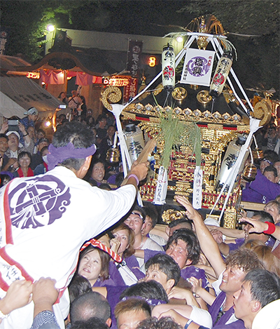 本神輿が、神社の鳥居をくぐり境内へと入っていく「宮入」は午後9時30分から。本殿の前では、担ぎ手たちがジャンプして本神輿を上下させる「縦もみ」などが行われ、境内は熱気に包まれる。