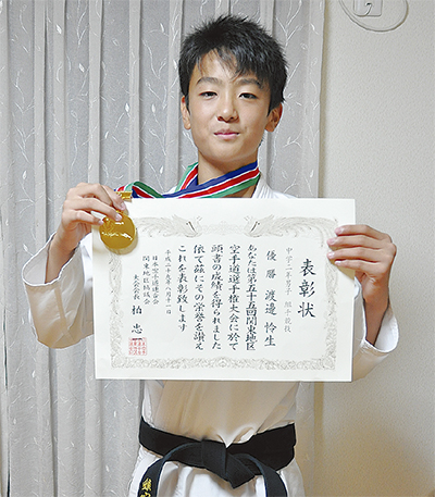 座間在住の渡邊怜生(れい)選手(西中2年)が8月11日、東京武道館で行われた第55回関東地区空手道選手権大会に出場、組手競技の部で優勝に輝いた。11月に開催される全国大会の出場を決め、日本一の目標を掲げている。