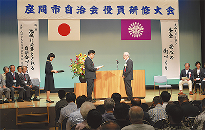 当日は、地域自治の発展に尽くしたとしてグリーンタウン自治会の菅毅さんが市自連の功労者に選ばれ表彰された=写真。菅さんは同自治会長を9年、市自連の理事を6年務めた。