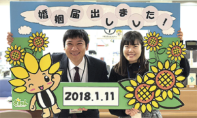 座間市はこのほど、婚姻届を提出した記念に、市役所で写真撮影をする人へのサービスの一環として、記念撮影用のフレームを作成した。フレームは、戸籍係職員が市に婚姻届を提出した人の幸せを祈り、心を込めて手作りしたもの。