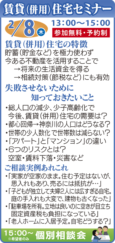 セミナーでは相続税改正の基礎や超低金利による市場動向などを踏まえ、メリットや注意点を解説。また税金の特例や節税方法、相続対策も同時に学ぶことができる。役立つ情報が満載なので、ぜひ参加を。※当日参加できない人にはセミナー資料を後日進呈(電話で申込みを)。