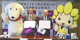 開店を前に、座間市とイオン(株)は2月9日、市民サービス向上と地域活性化をめざした包括連携協定を締結した。