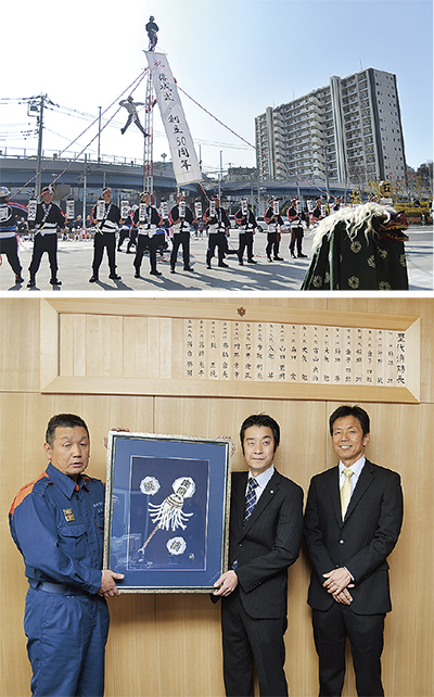 また、新庁舎の完成を祝い2月15日、「東京手描友禅」の伝統工芸士・佐波古直明さんと、(有)大塚建築の大塚幸一代表取締役が落合消防長のもとを訪問。佐波古さんは「纏」をテーマに制作した作品を、大塚代表取締役は歴代の消防長と消防団長の名前が入った木製の額縁を寄贈した。