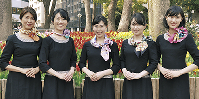 選ばれたのは写真右側より工藤杏奈さん(19)、鈴木佐知さん(38)、齊藤真梨乃さん(25)、今泉マユ子さん(48)、高野りえさん(59)。スカーフ大使は横浜繊維振興会が毎年公募。4月から1年間、各種イベントで横浜スカーフをPRする。
