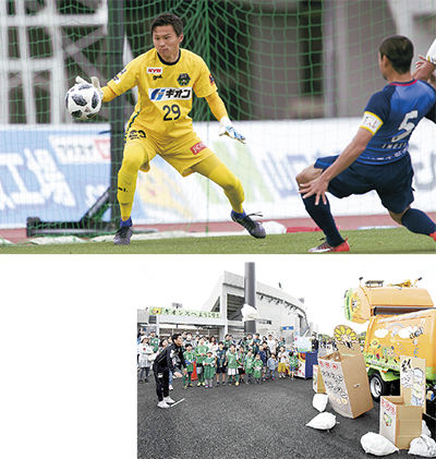 当日はSCに声援を送ろうと、座間市民427人を含む3573人が駆け付けた。会場では座間市のPRブースが設置され、ざまりんが描かれた市のごみ収集車などを展示。SCの選手らとともに、ごみ袋を収集車へと投げ入れるゲームで盛り上がった。