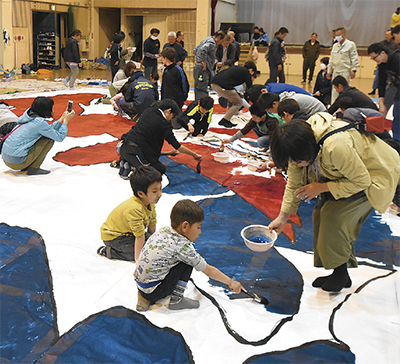 今年は初めて、キャンプ座間の米軍や陸上自衛隊員の有志が参加。小俣博副市長が文字の外枠を書いたのち、参加者は枠からはみ出ないよう注意しながら色を塗った。