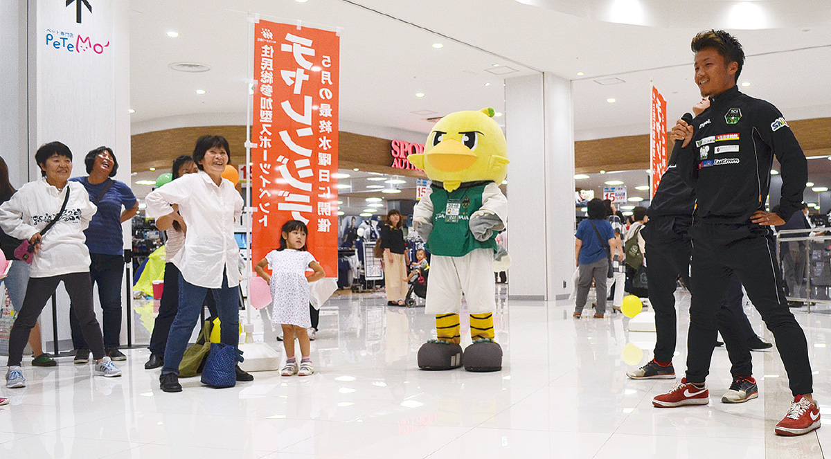 チャレンジデー当日、市内各地で様々なスポーツイベントが催された。スカイアリーナ座間では「We Love ZAMA!健康体操」を実施。イオンモール座間では、SC相模原所属の選手が、来店者とともにストレッチ。栗原中央出身のDF・山口聖矢選手(24)も駆けつけた。