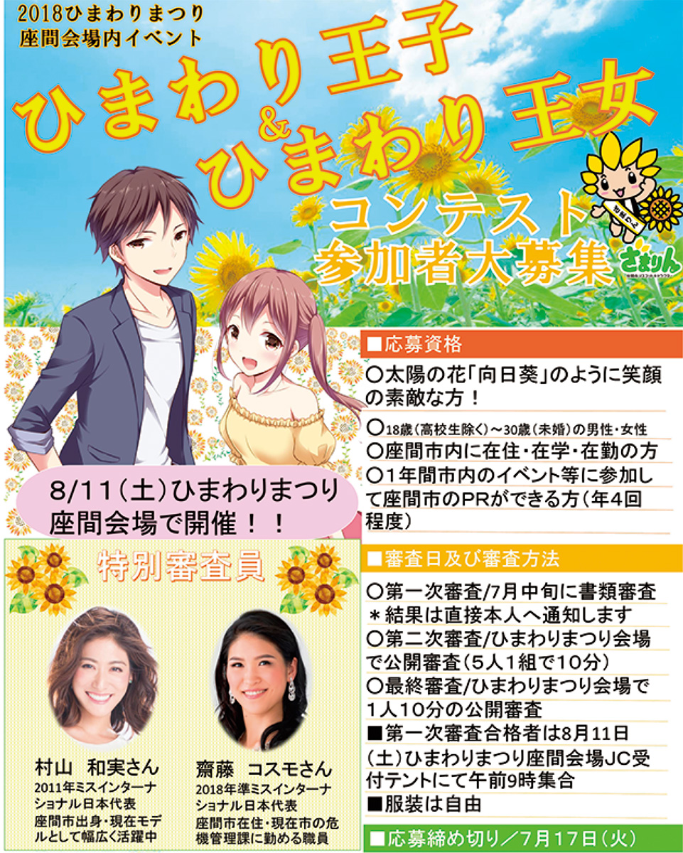 (一社)座間青年会議所(座間JC)は今年のひまわりまつりに合わせ、「ひまわり王子&ひまわり王女コンテスト」を初開催。7月17日(火)までエントリーを受付ける。対象は18歳(高校生を除く)から30歳の市内在住・在学・在勤者(男女とも未婚者)。「王子」と「王女」には、座間の観光大使として1年間、市の魅力をPRしてもらう。