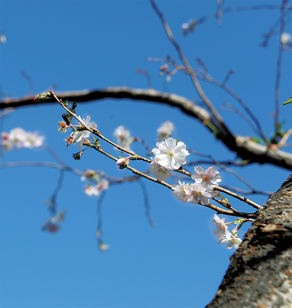 八重咲の淡い色の花をつける『十月桜』は、4月上旬と10月から12月にかけて2度開花する珍しい品種。「今年はちょっと遅く11月に入ってから見ごろになるのでは」