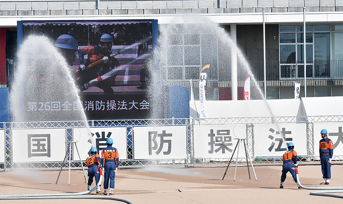 全国各地で予選を勝ち上がった消防団が、日頃の訓練成果を競い合う頂上決戦。同分団が出場した「ポンプ車の部」は、5人一組で行う競技。第1線・第2線と呼ばれる2本の消防ホースの延長、接続をすばやく行い、標的に向かって放水する。今大会では23チームが出場した。