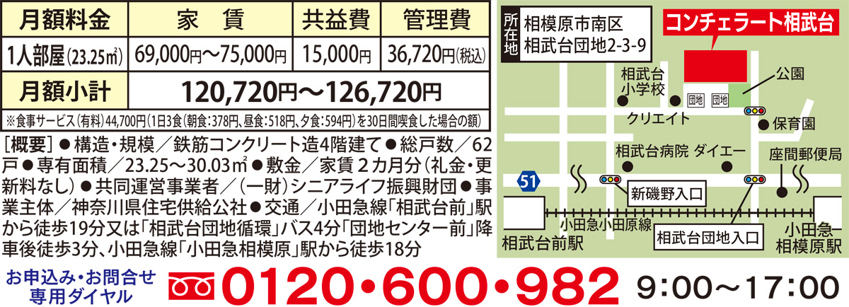 開設から5年、高い入居率で推移する、神奈川県住宅供給公社が事業主体であるサービス付き高齢者向け住宅(=サ高住)「コンチェラート相武台」で、年内最後の見学会を開催する。参加無料、電話で希望の日時を伝え申込みを。
