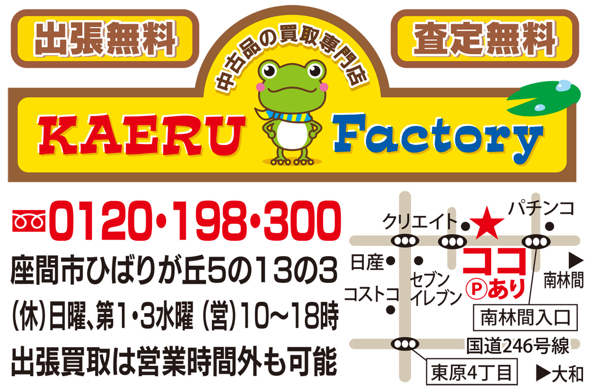 「あなたのいらないモノを誰かのいるモノにカエル」がモットーの中古品買い取り専門店「かえるファクトリー」。買い取り方法は「出張買取」と「店舗受付」の2種類。依頼品が多い人は出張を、自分の予定に合わせて持ち込みたい人は店舗がオススメだ。引っ越しや片づけを考えている人向けに、部屋の丸ごと片付けも受付中。12月末迄に「TN(タウンニュース)見た」で買取依頼すると箱ティッシュ5箱進呈。