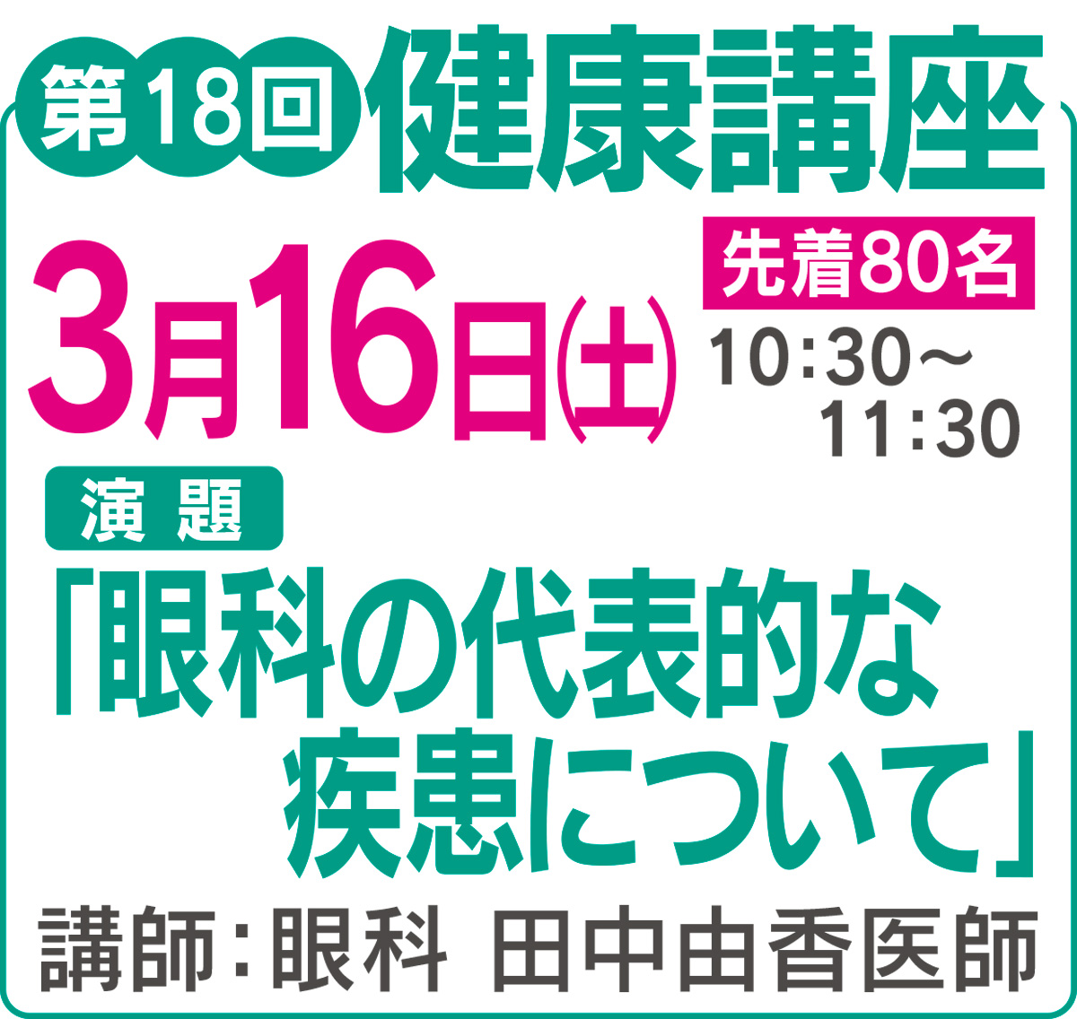 医療の最新情報から予防・生活改善など様々な知識を得られる座間総合病院の「健康講座」。今回は白内障や緑内障などの「眼科の代表的な疾患について」をテーマに、同院眼科の田中由香医師が講話する。参加費無料。事前予約制。