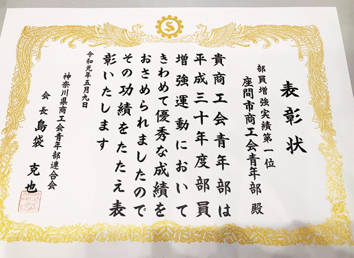 また座間市商工会青年部は、2年連続で部員増強が県内1位となり、表彰された。座間市商工会青年部は増員部員数15人で1位、続いて伊勢原市商工会青年部が6人で2位、3位は5人の山北町商工会青年部。座間市商工会青年部の部員数は2年前から倍増となった。