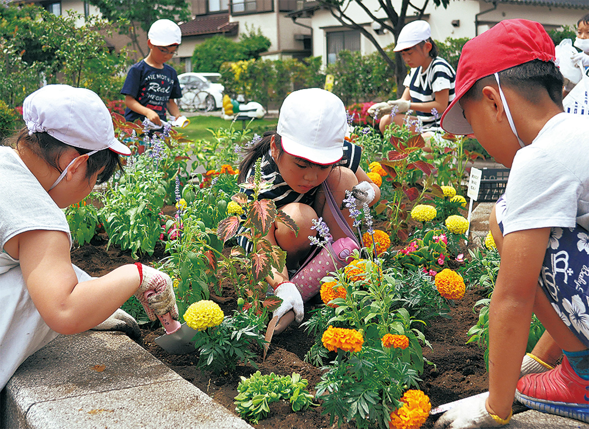 市内各地で小中学生や地元住民らが地域環境美化のために花の苗植えを行った。
