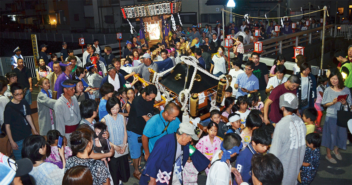 1989年から地域を盛り上げようと行われている同神社の神輿渡御。子ども神輿と大人神輿の担ぎ手による威勢のいい掛け声と迫力満点の宮入は、夏の風物詩として定着している。