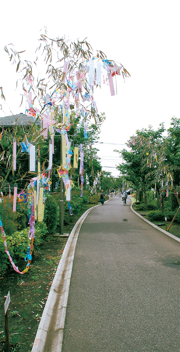 期間中は、地域の保育園や幼稚園、小・中学校、住民、高齢者団体から寄せられた願いが記された短冊が結われた笹飾りが、あいにくの空模様の中、実行委員の手によって小道に施され、道行く人々を楽しませていた。