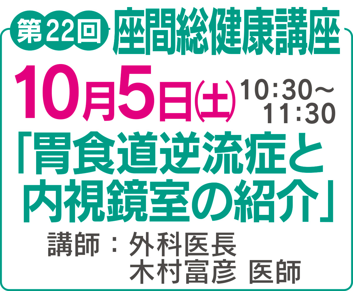 医療の最新情報から予防・生活改善など様々な知識を得られる座間総合病院の「健康講座」。今回は「胃食道逆流症と内視鏡室の紹介」をテーマに、同院外科医長の木村富彦医師が講話する。参加無料。事前予約制。先着80人。