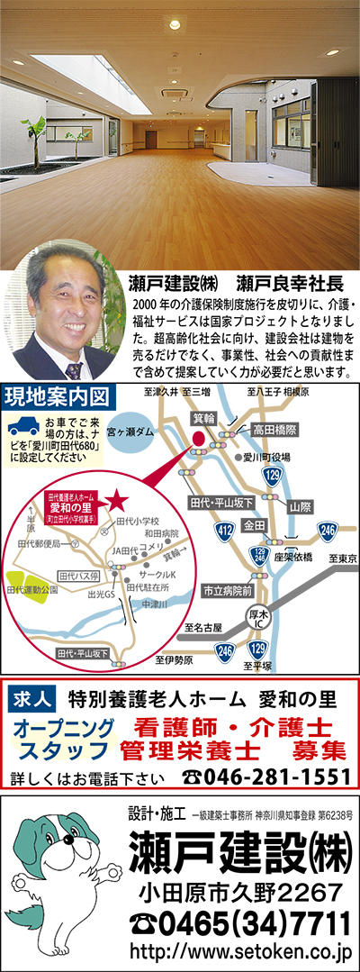特別養護老人ホーム「愛和の里」の企画・施工を手がけた瀬戸建設(株)(本社/小田原市久野)によると、自分の土地が地域に喜ばれ、貢献できることから、こうした福祉施設を提案しているという。また、不況の影響を受けることが少ないのも特長。高齢化が進む中で、介護・福祉施設の需要はますます高まっている。