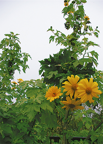 皇帝ヒマワリはキク科の植物。「ニトベギク」「ガリバーヒマワリ」「木立ヒマワリ」などとも呼ばれる。真夏に咲くヒマワリとは別。降霜の早い地域では開花は見込めないと言われており、きれいに咲かせ続けるのは難しいとされる。