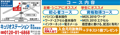 昨年10月にオープンしたばかりのキュリオステーション厚木市役所前店は、既に18歳から82歳までの初心者脱出を目指す人からビジネススキルの習得、さらに就職活動に必要な資格取得を目指す人などが通っている。月3150円の定額制で、通い放題。しかも、当日の予約やキャンセルも無料。「今始めれば、夏までには就職に断然有利な資格取得も十分可能です」と同スクール。合格するまでサポートしてくれる。資格取得を目指して「初心者コース+資格取得コース」など同時に選択する入会者には、入会月の月謝(3150円)が無料になるほか、希望のテキスト一冊をプレゼント。まずはお気軽に無料体験へ。体験希望は下記まで。