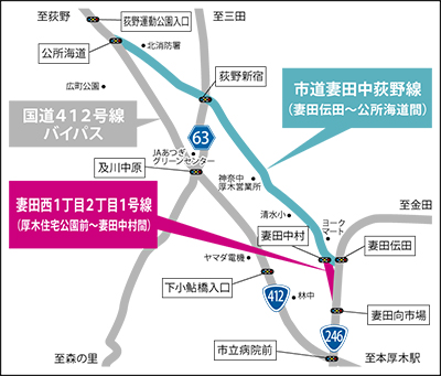4月1日から国道412号線の旧道区間が、厚木市道へと変更された。市道に変更されたのは、妻田伝田交差点から公所海道交差点までの3935mと、国道246号線から分岐して妻田中村交差点につながる409mの部分。この変更は1984年から市と、同道路を管理する県との間で協議が続けられてきたもの。30年近くの期間を経て、ようやく変更実施となった。