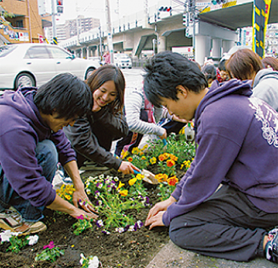 東京農業大学バイオセラピー学科の人間植物関係学研究室(宮田正信教授)の学生40人が4月20日、市内田村町から旭町の歩道約200mの植栽を行った。