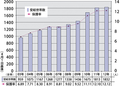 人口1000人あたりの受給者数を示す保護率は12・12人で、過去10年で最も多い。今年度の生活保護費の当初予算は、48億8000万円で、一般会計736億円に占める割合は6・63%。このうち国や県の負担金を引いた市費負担は10億1540万円に上る。