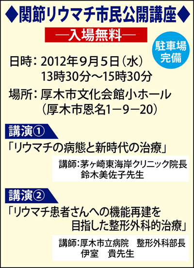 リウマチをテーマにした市民公開講座が全国各地で開催され話題を呼んでいる。神奈川では9月5日(水)、厚木市文化会館小ホールで行われる。厚木医師会・厚木整形外科医会・中外製薬(株)の共催。内容はリウマチ新時代をテーマに茅ヶ崎東海岸クリニック院長の鈴木美佐子先生と厚木市立病院整形外科部長の伊室貴先生の講演。