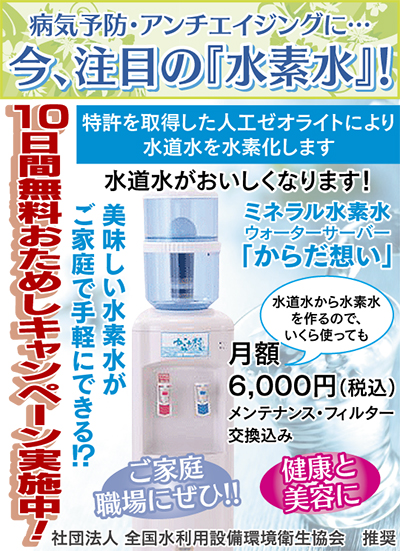 厚木市田村町にある(株)厚木食品がミネラル水素水のウォーターサーバー『からだ想い』のレンタル販売を始めて一年余。月々のレンタル代金は6000円〜。水道水から水素水を作るもの。低価格でミネラル水素水を飲み、使うことができると好評。健康志向のユーザーが増え続けている。