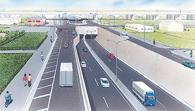道路を管轄する県広域幹線道路事務所の道路建設課によれば、立体化は南北にのびる国道129号線が県道22号線の下を通る「アンダーパス」と呼ばれる方式。立体化区間は片側2車線で、距離は500m。工期は2016年3月15日までの予定。